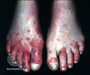 - Expose the patient and look to see the extent and spread of the rash. Furthermore, observe at this stage for any obvious oedema which could suggest early stages of renal damage.