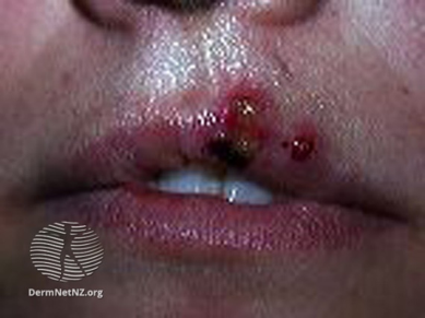 The herpes simplex virus presents with painful blistering lesions and commonly affects the mouth (cold sores) or genital regions. It is transmitted by the touch of an active lesion, however asymptomatic viral shedding can also occur. After a primary infection, herpes can recur multiple times as the virus lies dormant in the nerve root.