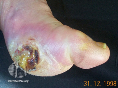 Ulcers are generally found on pressure areas such as the sacrum, heels and feet. Usually, due to the various co-morbidities that exist with ulcers, many patients may not realise that they are present and may be reported to you by nursing staff. Ulcers can vary in size and depth but are usually relatively well-demarcated. As patients may not be aware of them, they can often present in more severe cases.