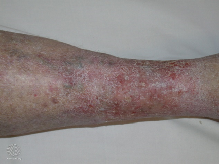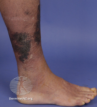 Patients tend to initially present with non-specific skin changes such as hyperpigmentation, venous ulcers, dermatitis (venous eczema), atrophie blanche – white plaques on the skin and chronic swelling. They make also complain of pain and itching of the skin.